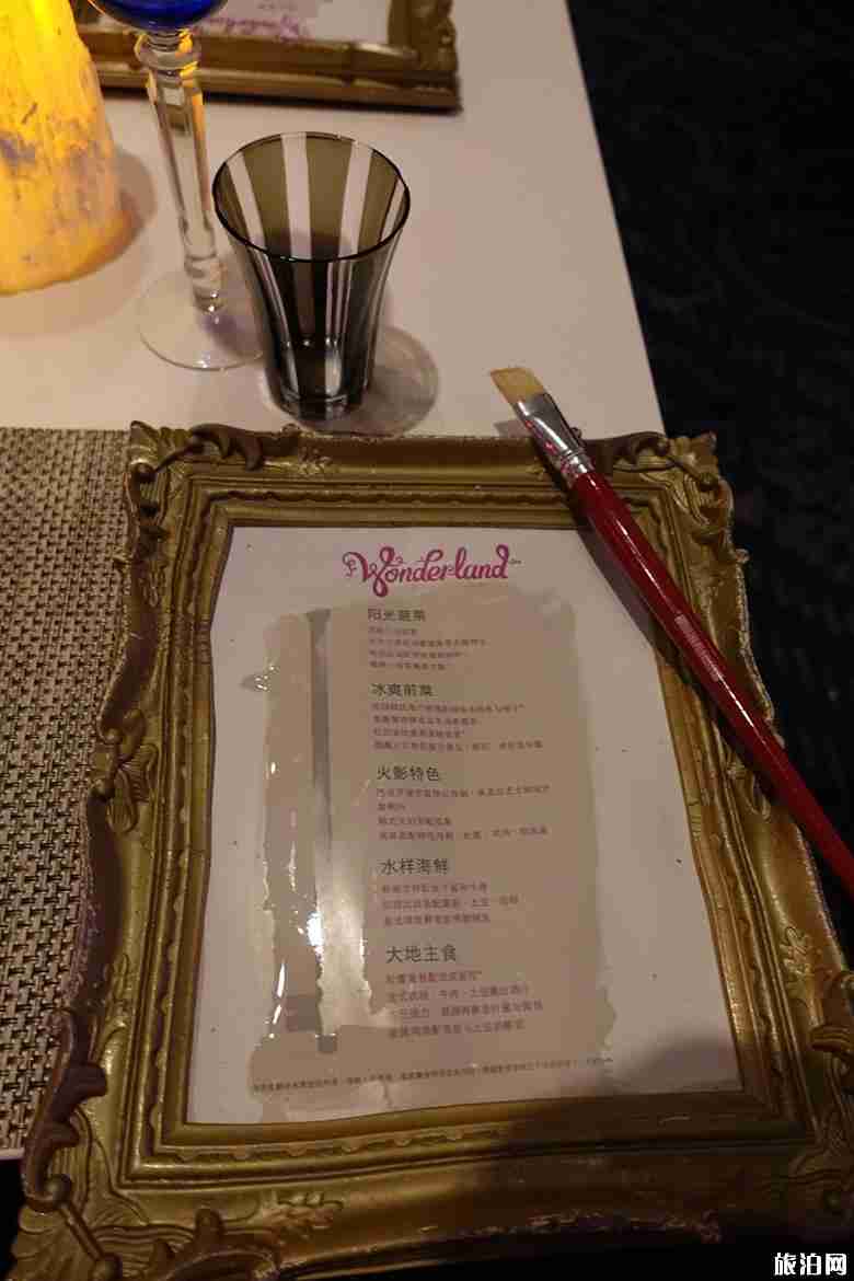 整个餐厅的风格比较昏暗,从装饰到服务员的服装都是满满的“爱丽丝梦游仙境”即视感。上面的照片是餐厅的菜单,主要是让客人体验一下,用毛笔蘸一点魔法水(自来水),涂满整张菜单,过一会儿菜品就出现了。
