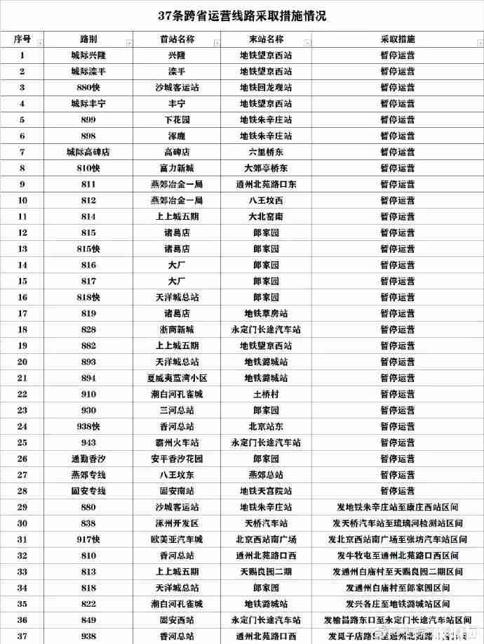 为配合河北省疫情防控需要,应河北省三河市、涿州市等15个属地政府部门的要求,从1月28日起,北京市公交集团运营的28条跨河北省点到点直达线路,采取暂停运营措施;9条在北京市域内设站点的线路,采取北京市域内区间运营措施。