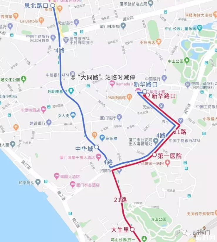 中山片区市政设施提升改造工程影响,从2019年11月2日起调整4路、21路公交线路及停靠站点