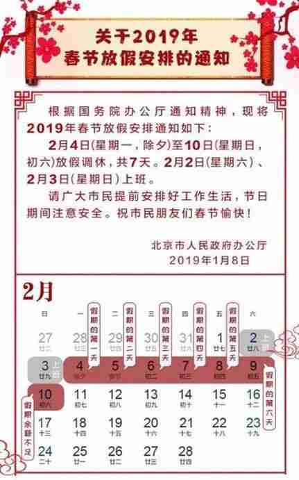 根据北京市人民政府办公厅1月8日发布关于2019年春节放假安排的通知、北京市人民政府关于实施工作日高峰时段区域限行交通管理措施的通告精神,2019年2月2日(星期六)、2月3日(星期日),2019年2月4日至10日(春节假期)期间,本市机动车不受工作日高峰时段区域限行交通管理措施的限制;非本市进京载客汽车不受7时至9时、17时至20时禁止在五环路(含)以内道路行驶和9时至17时按车牌尾号区域限行交通管理措施的限制。