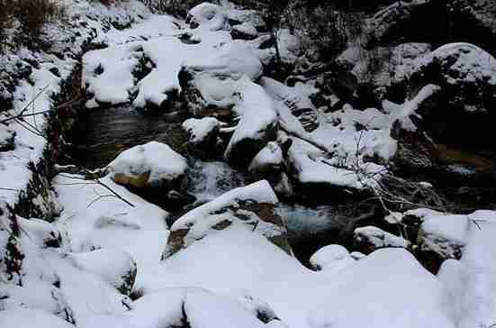 这里,往日溪水流过的怪石上覆盖了厚厚的积雪
