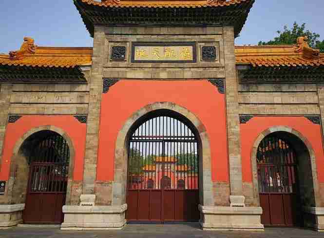 入口处牌坊上书“德配天地”四字,与入口相对的另一侧牌坊上书“道贯古今”四字。