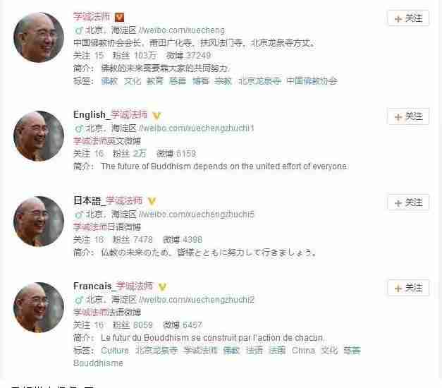 而龙泉寺的大号微博还有很多,比如住持学诚法师,就有汉语、英语、日语、法语、德语等不同语言版本的微博十多个。