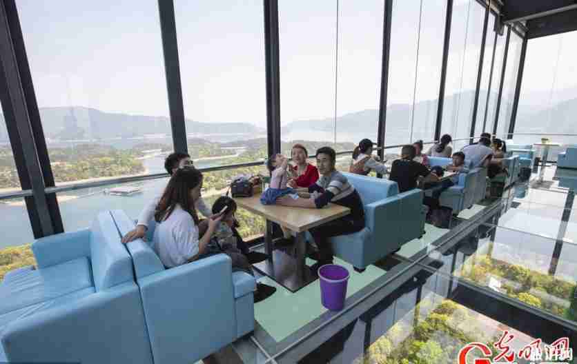 2019年4月7日,清明小长假期间,总高99米的庐山西海之星玻璃观光塔上,全透明的咖啡屋和高空玻璃栈道吸引游客前来游玩,体验在高空置身山水之间的惊险和刺激。