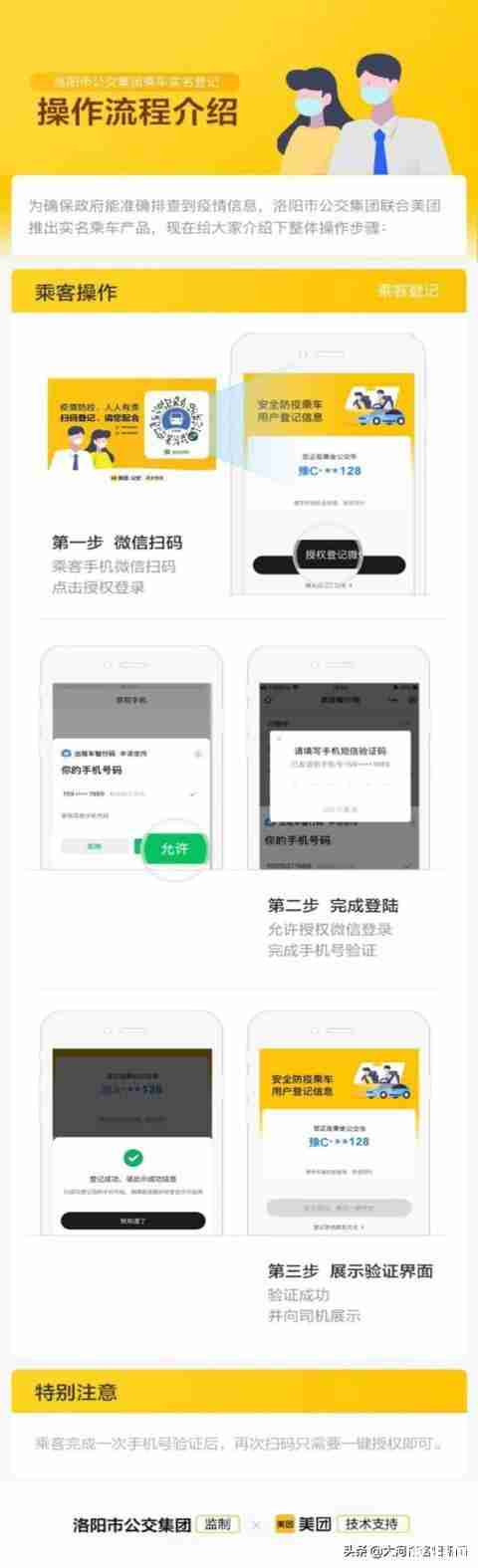 经洛阳市公交集团与美团公司协商,由美团提供全套技术支持,通过在市公交集团所属公交车上张贴专用二维码,做到全市公交车辆“一车一码”,对乘车乘客进行扫码实名登记。