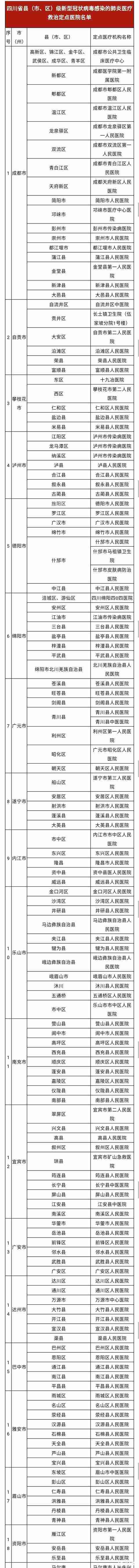 关于公布四川省县(市、区)级新型冠状病毒感染的肺炎医疗救治定点医院的公告