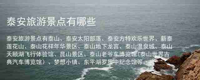 泰安旅游景点有泰山、泰安太阳部落、泰安方特欢乐世界、新泰莲花山、泰山花样年华景区、泰山地下龙宫、泰山温泉城、泰山天颐湖飞行体验馆、昆山景区、泰山老爷车博览馆(泰山世界古典汽车博览馆)、梦想小镇、东平湖罗贯中纪念馆等。