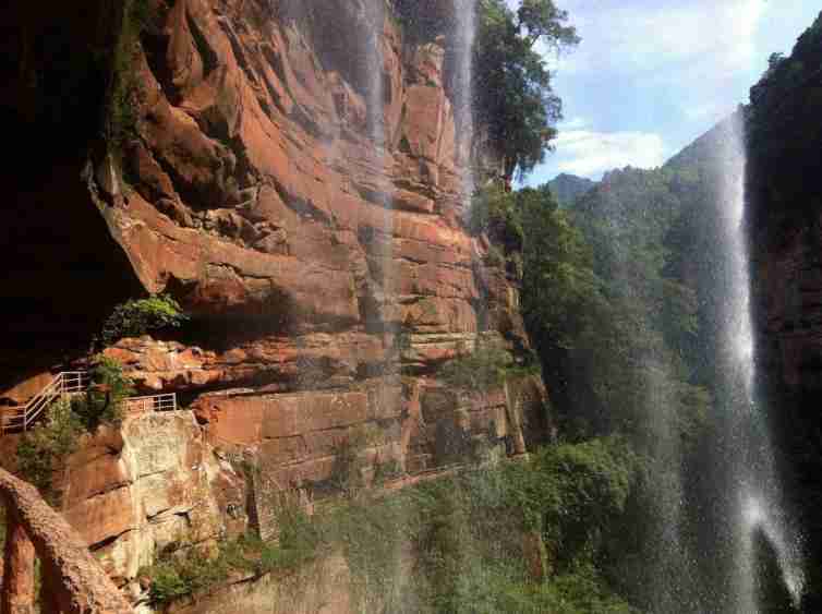 下了船,我们便来到了望香台瀑布。据说,望香山瀑布高一百五十二米,宽三十七多米,是四面山最为壮观的瀑布,比著名的黄果树瀑布高出一倍以上,堪称华夏第一高瀑布。每到夏季涨水季节,白瀑悬空势若天河决下,水声如雷,震山撼谷,腾起的水雾如滚滚浓烟,形成了两道乳白色气流袅袅升浮飘逸。阳光斜照,紫烟凌虚,化出无数彩虹,我们站在不同角度去看,样子都不一样。
