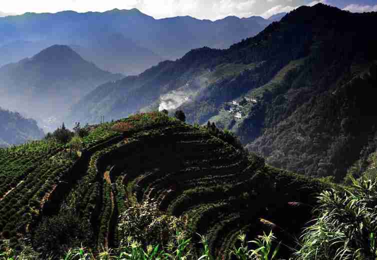 上世纪60年代,蜈蚣岭人民前后经历10年,修建梯地茶园近千亩。此后又经过不断的整砌和修缮,全村800余亩梯地发展成集中连片茶园,浑然一体,形成了全国独一无二的高山石砌梯形茶园,蔚为壮观,青山绿水映山红,这里人文景观深受摄影爱好者的喜爱,是摄影爱好者的天堂。
