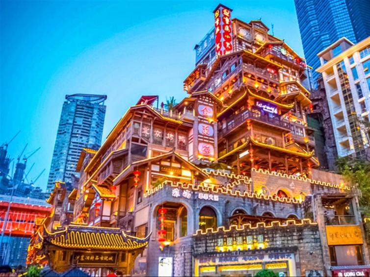 洪崖洞是逛山城老街、观赏两江风光、品尝当地美食的好去处。由纸盐河酒吧街、天成巷巴渝风情街、盛宴美食街和城市阳台四部分组成,从最底到顶层共有11层,隔层功能不同,有餐馆、酒吧及土特产商铺等。以最具巴渝传统建筑特色的吊脚楼为主体,依山就势,顶层可远观江景,夜晚时候灯火通明,堪称山城一景。建议晚上去洪崖洞看夜景,灯光开启的时候,十分震撼。