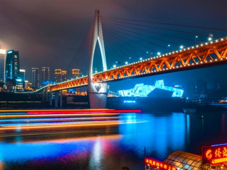 重庆千厮门嘉陵江大桥位于渝中半岛千厮门处,重庆著名景点洪崖洞、重庆大剧院旁,距解放碑中央商务区仅几百米。该桥通过渝中隧道与东水门长江大桥贯通,形成连接江北城区、解放碑CBD和南岸弹子石片区的公轨两用快捷通道。设计为单塔单索面部分斜拉桥,上层为城市道路桥长878米,下层为双线轨道交通桥长720米。
