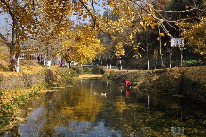 指南村位于临安东天目山麓,太湖源头的南苕溪之滨,紧依神龙川、太湖源、天荒坪等知名旅游景点。每到深秋时节,金黄的银杏、火红的枫树则将这里涂抹成“泼了浓墨的高山风情油画”,为是江浙最美赏秋胜地之一。当红色的枫树随意地飘落在村子的每一个角落,指南村的秋意便在这不经意间进入了佳境。村庄左右两侧还有四百七十多亩梯田,蔚蔚壮观。沿公路盘山而上有一天池,全年池水碧绿,游鱼成群。水、屋、树、文物、墓、姓、村,这“七古”赋予了指南村独特的魅力。