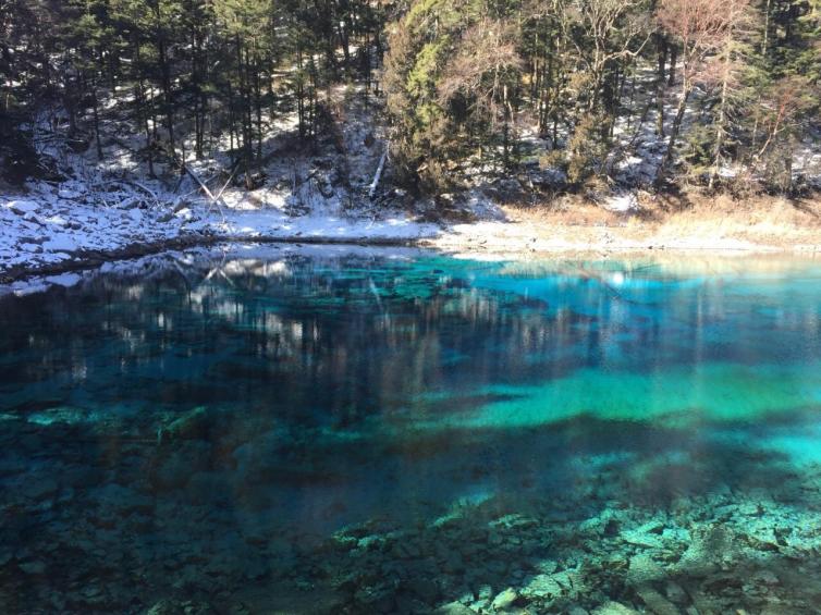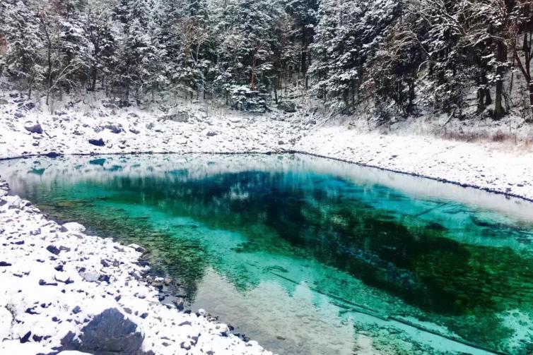 山岭峰谷这时都变得白雪皑皑、银装素裹,雪线以下的林涛树海则继续穿着秋的盛装。火红的枫叶,翠绿的松柏,金黄的桦树林与蓝天白云、皑皑雪峰、翠海飞瀑交相辉映。森林雪域相衬,沟谷纵横交错,湖溪绿树倒影,瀑布倒挂层叠。九寨沟的初冬,就如艺术大师精心绘出的一幅幅绝伦无比的经典画作。