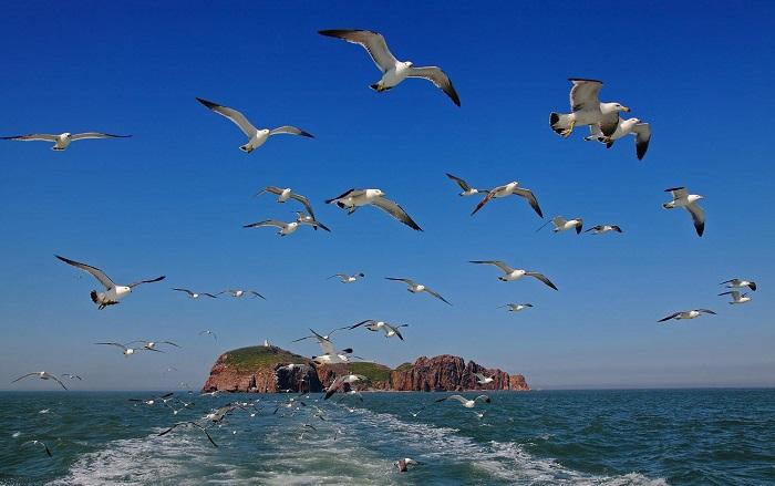 ?海驴岛每年春夏,海驴岛上聚集了几十万只鸥鹭,形成遮天蔽日的奇观,被称为“海上仙山、鸥鹭王国”。海岛经长久的潮水波浪冲击侵蚀,岛的悬崖满目疮痍,洞孔累累,大的海蚀洞内可以行舟,小的海蚀洞则仅能容纳数人。绝壁危峰兀立,怪石嶙峋,各具风韵。朱红色的岩石,层层叠叠,造型生动,步步有景,景景生情,令人心驰神往,回味无穷。