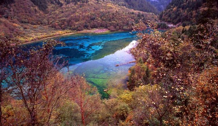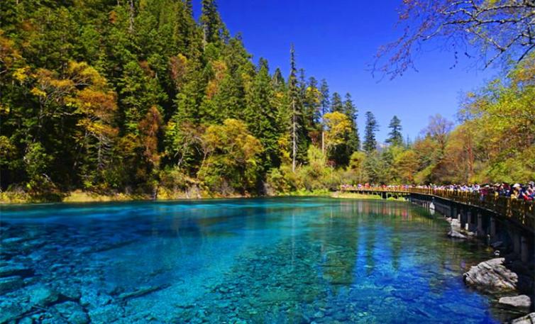 五彩池位于则查洼沟南段,是九寨沟最小、最艳丽的池子,且四季不冻。以秀美多彩纯净通透而闻名,因富含碳酸钙的水中,所以湖水光影斑驳。有阳光的时候时是拍摄的最好时间,在不同的位置和角度,呈现出不同的色彩。五彩池的水来自高处的长海,水中生长着水绵、轮藻、小蕨等水生植物群落,还生长有芦苇、节节草、水灯芯等草本植物。这些植物所含叶绿素深浅不同,在富含碳酸钙质的湖水里,就呈现出不同的颜色,使得五彩池上半部呈碧蓝色,下半部则呈橙红色,左边呈天蓝色,右边则呈橄榄绿色,五彩斑斓。五彩池池水清澈通透,透过水面,能清晰的看到池底岩石的纹路,在阳光的照耀下,闪耀着五彩的光芒。