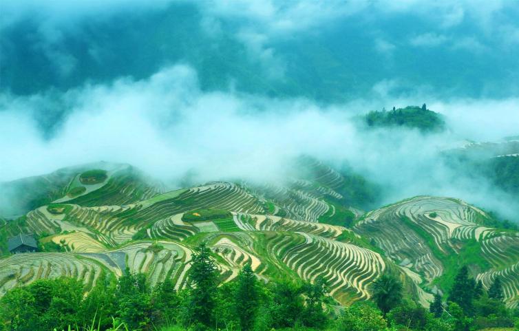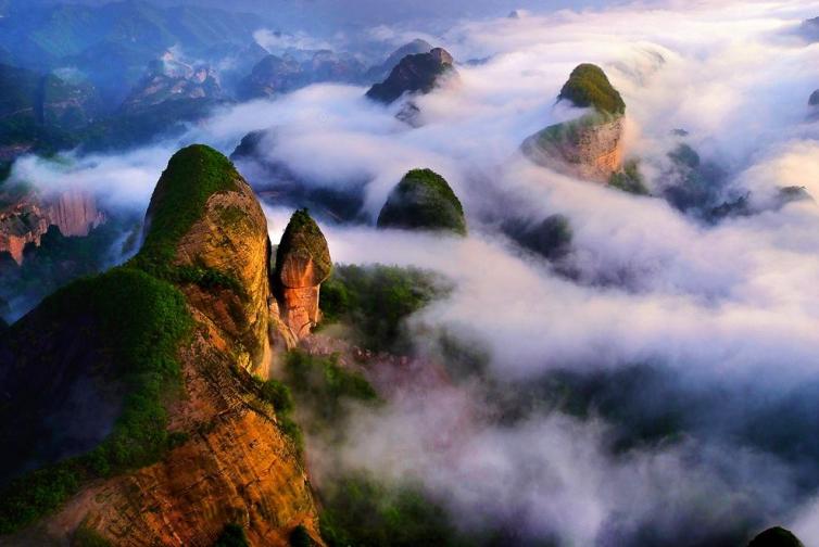 受风雨蚀化程度不对称的影响,部分山体形成一侧陡坡一侧缓坡的形态,当山顶泛起云海,有如鲸群在海中竞相嬉戏,玩闹前游。如遇晴朗天气,日出及日落景象也十分壮丽。