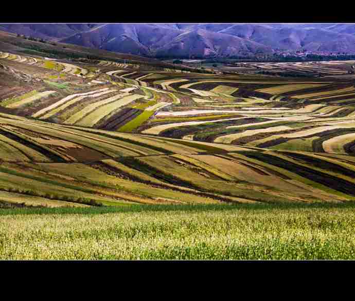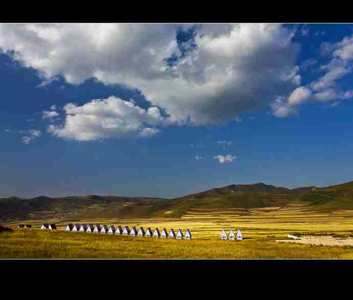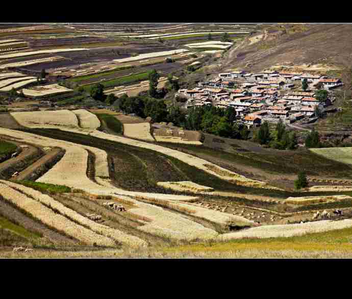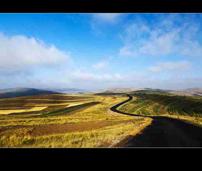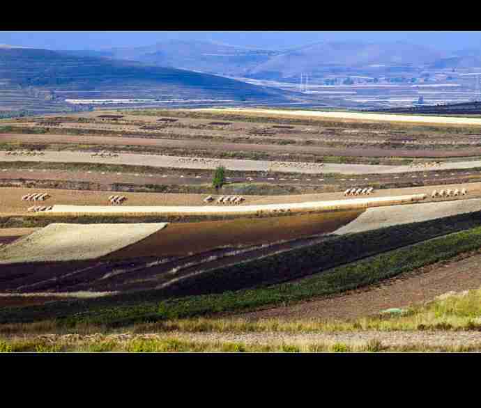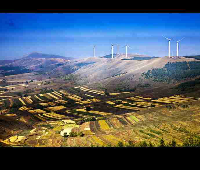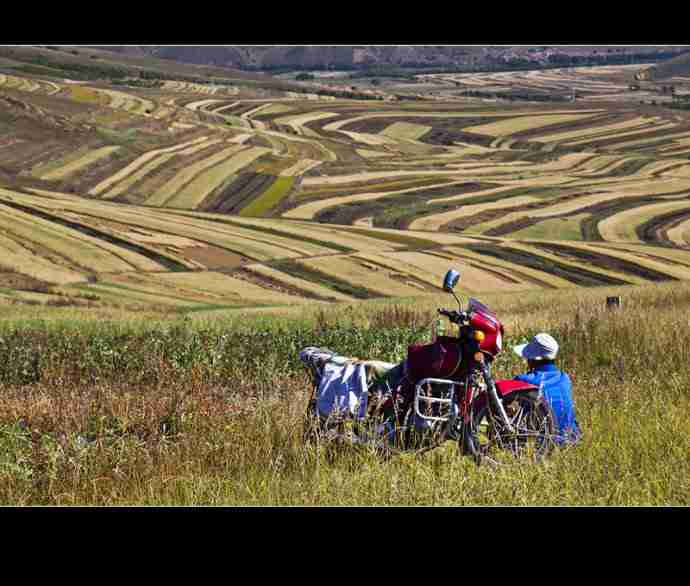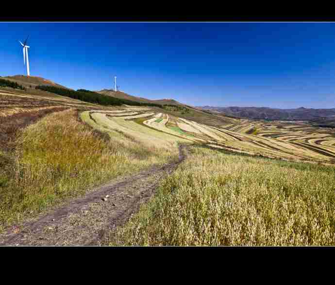 一座座高高耸立的风力发电机,沿着山坡蔓延开来,占满了人整个视线。山顶的风呼呼作响,大风车也卖力的摇动着。初秋的风已经有了阵阵凉意,我穿着抓绒冲锋衣都丝毫没有感到暖意。从风电林区回来的路上,意外发现了这个转弯路上的小山坡,可以俯瞰到色彩缤纷、排列整齐的梯田中那暖暖的红顶的小村庄,已经接近中午了,仿佛从那袅袅的炊烟中闻到了饭香。山坡上,一个年轻人坐着,望着眼前的庄稼,充满了丰收的喜悦。在这样一片依然靠天吃饭的土地上,赶上一个好年头是多么的不容易。