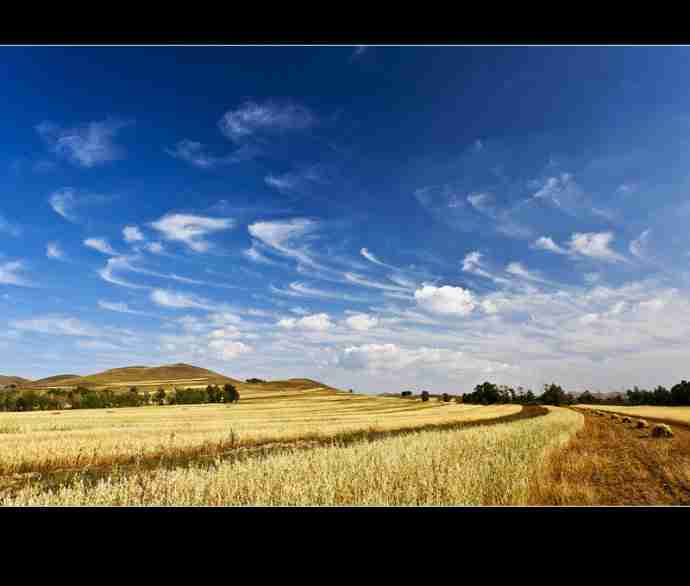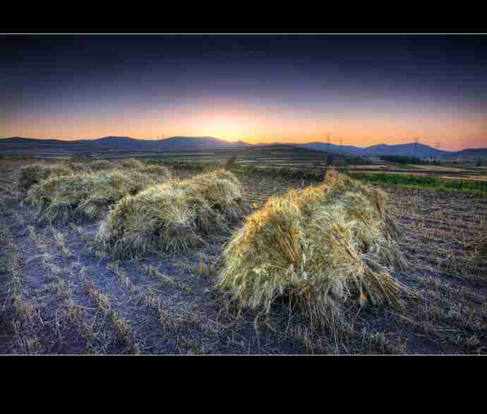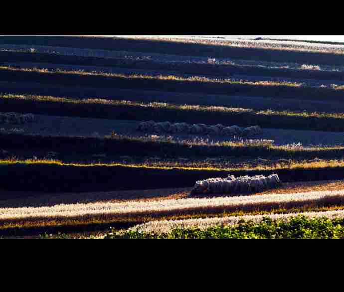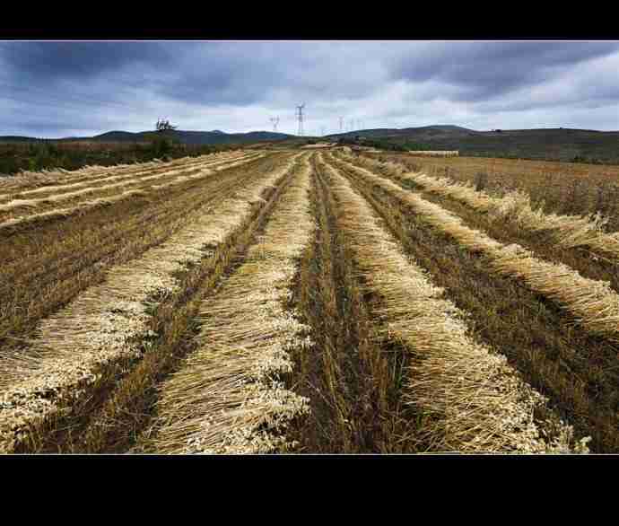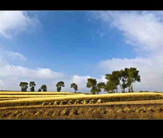 尽管头顶的雨不时滴落在我的脸上,我还是能从厚厚的云层里捕捉到一丝希望的光芒,投射在码好的草垛上。脚下的垄沟,笔直的向前延伸,将收获的、等待收获的,链接在了一起。