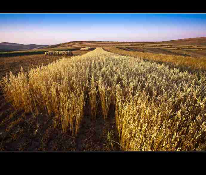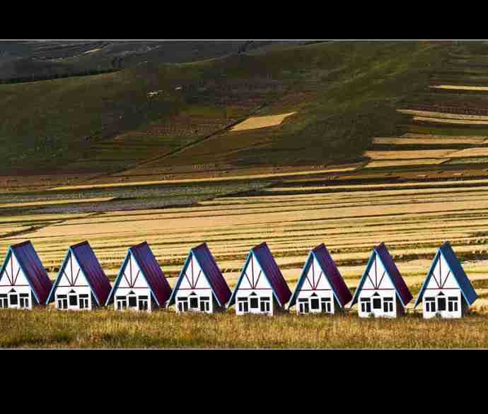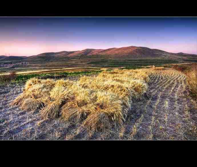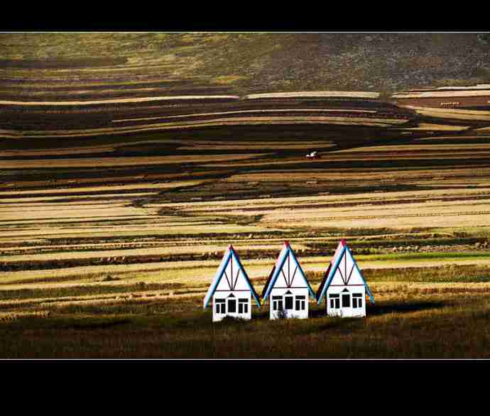 这里不要门票,因为实在没什么风景可看。只有眼前这几座童话故事里的小木屋,和远处的层田。这时已经快5点了,我决定马上回山岔村拍落日。好在桦皮岭距离山岔村不是很远,20多分钟的路程就到了。正赶上最后的一抹夕阳拂过山梁,洒下一缕余辉,映红了沉甸甸的麦穗。