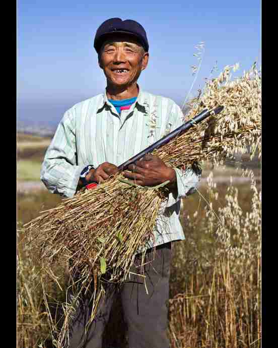 去往风电林区的路上,碰到了这位冯大爷。此时他正顶着烈日,在田间收获莜麦。他耐心的教我怎么使用镰刀,并让我试试。老人这辈子没怎么照过像,听说我会把相片寄给他非常开心,操着一口我听不大懂的方言,告诉我他的地址。