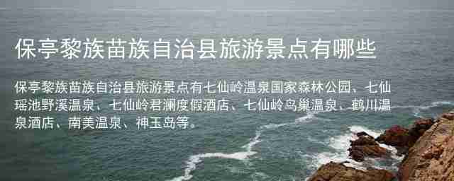 保亭黎族苗族自治县旅游景点有七仙岭温泉国家森林公园、七仙瑶池野溪温泉、七仙岭君澜度假酒店、七仙岭鸟巢温泉、鹤川温泉酒店、南美温泉、神玉岛等。七仙岭温泉国家森林公园:位于海南省保亭黎族苗族自治县七仙岭温泉旅游区1号七仙岭温泉国家森林公园,国家AAAA级景区,雨林温泉谧境,国际养生家园。门票价格在:52元左右七仙瑶池野溪温泉:位于海南省保亭县七仙岭热带雨林旅游区7号,暮雨云蔼中,呼吸雨林精养,褪去一路风尘。门票价格在:128元左右七仙岭君澜度假酒店:位于海南省保亭县市七仙岭国家森林温泉公园内,背枕青山,胶林如海,椰树婆娑,槟榔亭亭。门票价格在:86元左右七仙岭鸟巢温泉:位于海南省保亭黎族苗族自治县七仙岭温泉旅游区1号七仙岭温泉国家森林,矿泉疗养康复、观赏民族风情、参加登山观景。门票价格在:50元左右鹤川温泉酒店:位于海南保亭黎苗自治县七仙岭国家温泉森林公园内,独特的热带雨林景观,浓郁的的黎苗风情。门票价格在:68元左右南美温泉:位于海南省保亭七仙岭风景旅游区大温泉2号,“半原生”状态的温泉群。门票价格在:100元左右神玉岛:位于海南省保亭县响水镇毛真水库神玉岛文化旅游度假区,以中华玉文化和生态文化为主题。门票价格在:40元左右旅游攻略https://wWw.cAOYUaNtIaNLU.ORg 文章来源:https://www.caoyuantianlu.org/4641.html
