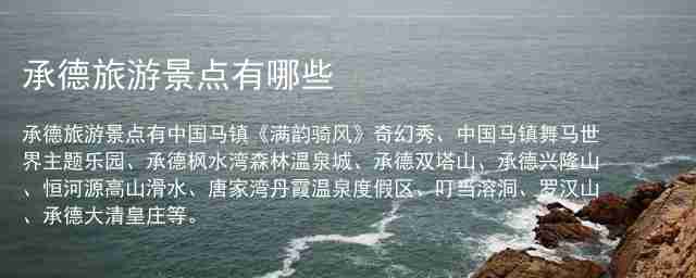 承德旅游景点有中国马镇《满韵骑风》奇幻秀、中国马镇舞马世界主题乐园、承德枫水湾森林温泉城、承德双塔山、承德兴隆山、恒河源高山滑水、唐家湾丹霞温泉度假区、叮当溶洞、罗汉山、承德大清皇庄等。中国马镇《满韵骑风》奇幻秀:位于河北省承德市丰宁满族自治县大滩镇北中国马镇,丰宁坝上草原综合性旅游度假区。门票价格在:168元左右中国马镇舞马世界主题乐园:位于河北省承德市丰宁满族自治县大滩镇北中国马镇,走进草原,领略生态之美。门票价格在:84元左右承德枫水湾森林温泉城:位于河北省承德市隆化县茅荆坝温泉文化旅游产业园区,泡着温泉,感受着历史文化。门票价格在:87元左右承德双塔山:位于河北承德双滦区承德避暑山庄西南十公里处,国家AAA级景区,林壑优美,溪水奔流,鸟语花香。门票价格在:44元左右承德兴隆山:位于河北省承德市兴隆山景区位于兴隆县大水泉乡迷子地村。大美兴隆山。门票价格在:193元左右恒河源高山滑水:位于河北省承德市兴隆县安子岭乡天桥峪村,释放情怀抒发激情之地。门票价格在:45元左右唐家湾丹霞温泉度假区:位于河北省承德市承德县仓子乡七家村里,依托丹霞地貌,被誉为“承德度假天堂”。门票价格在:30元左右叮当溶洞:位于河北省承德市承德县仓子乡唐家湾村,休闲度假、旅游观光的理想天地。门票价格在:60元左右罗汉山:位于河北省承德市双桥区武列河东岸,惟妙惟肖之态,比例匀称,神态自然。门票价格在:20元左右承德大清皇庄:位于河北省承德市滦平县兴洲村承德大清皇庄-承德兴春和农业集团有限公司,主营洗浴,汗蒸,各种室内水上乐园项目。门票价格在:50元左右旅游攻略https://Www.CaoYuanTIANlu.Org 文章来源:https://www.caoyuantianlu.org/4836.html