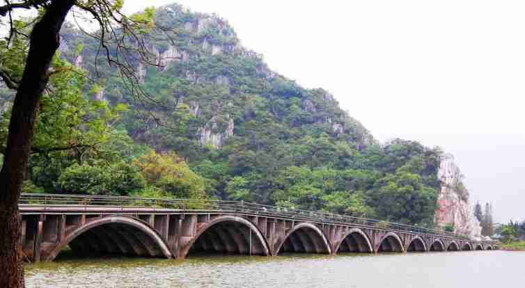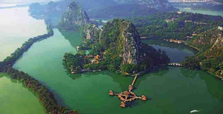 七星岩位于肇庆市,这里以喀斯特溶岩地貌的岩峰、湖泊景观为主要特色,七座排列如同北斗七星的石灰岩岩峰巧布在湖面上,20余公里长的湖堤把湖面分割成五大湖,风光旖旎。