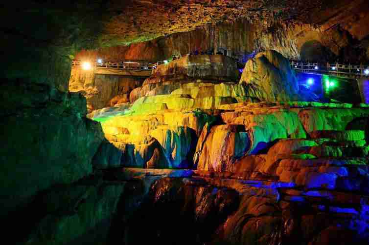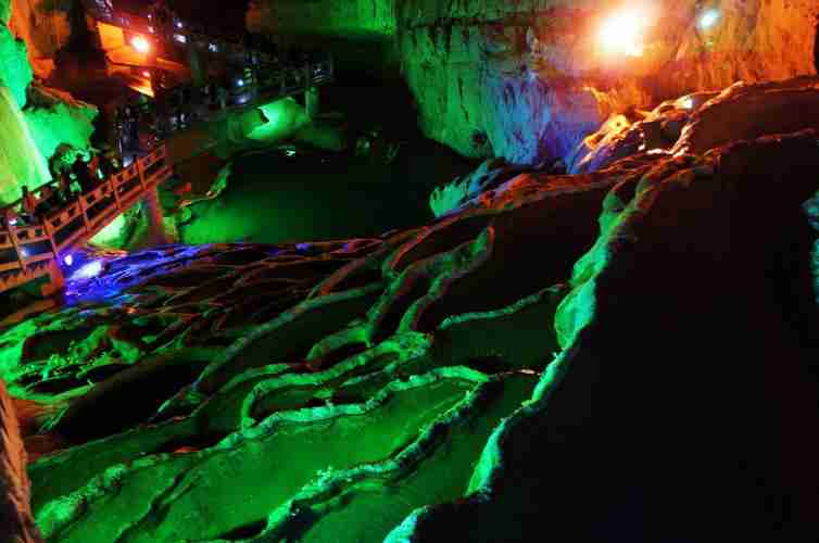 乘船回来就可以从入口的另一边进入景区游览了,走在峭壁之上,另一边就是湍急的河水,这还不是溶洞的范围。再往前走就是几个非常景点的溶洞了,具体的景色就不用我来描述了。身临其境和看电视图片完全不同,图片上只能看到那些配有灯光的景色,其实很多没有灯光的钟乳石也非常漂亮。没见过溶洞的人,那种震撼是无法用语言表达的。