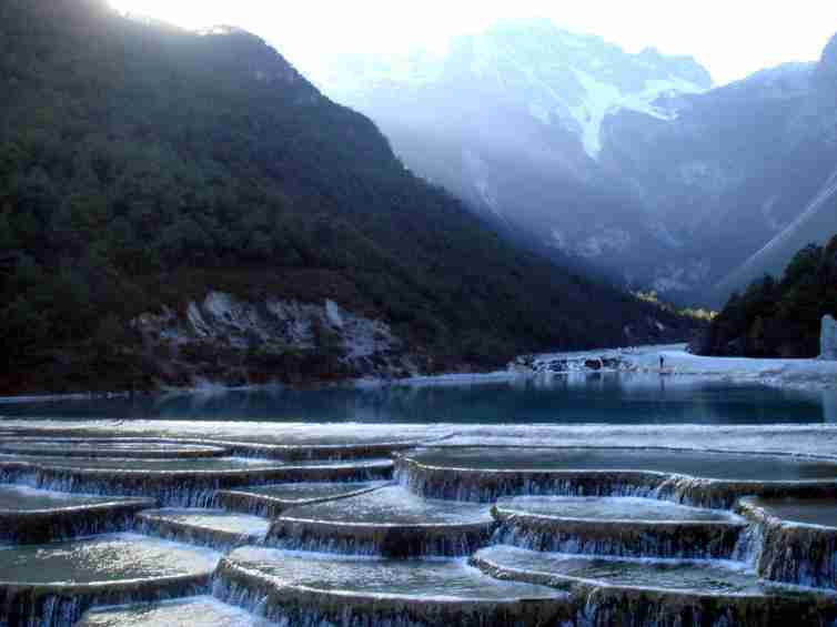 蓝月谷位于玉龙雪山脚下,与玉龙雪山属于同一景区,雪山上流下来的水,蓝绿蓝绿的,跟宝石一样,晶莹剔透。再加上雪山为背景,山中的绿树衬托,整个就是一幅很美的画。