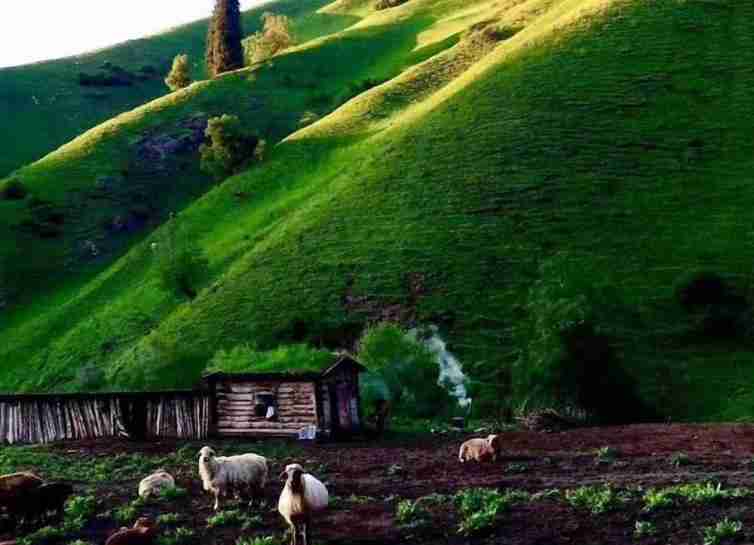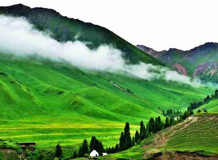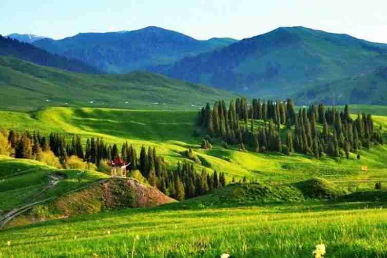 它是伊犁颇负盛名的五大草原之一,蓝蓝的天,绿茵茵的草坂,云杉林苍翠挺拔,喀什河两岸芳草茵茵。