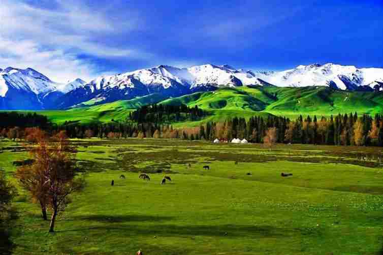 远处的山巅上皑皑白雪闪着银光,蔚蓝的天空白云朵朵,牛羊在草地上悠闲地觅食,置身在这如诗如画的草原上令人心旷神怡。