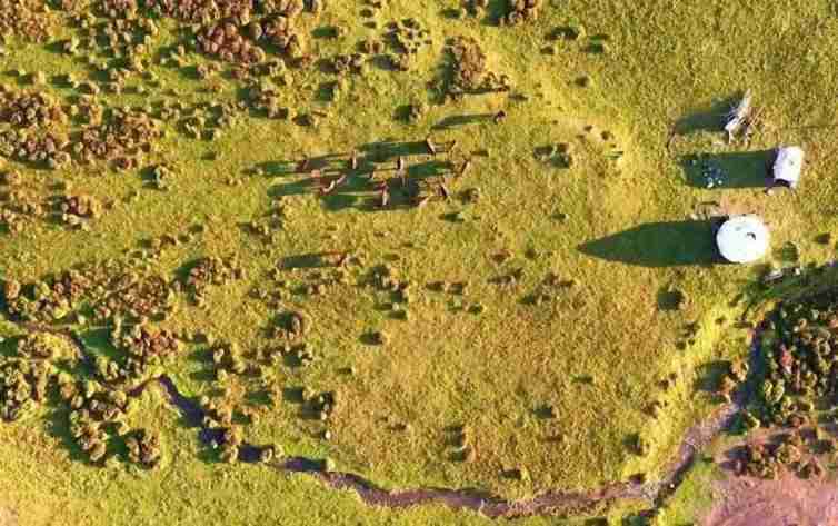 从空中俯瞰,毡房,马群,如地毯般的草坪。
