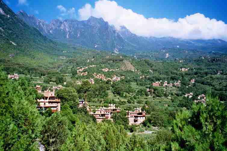 桑登寺是红教宁玛派白玉寺分寺,位于孟屯河谷上孟乡日波寨,由雅弘竹巴大师(活佛)修建于公元1435年,距今有五百多年的历史,寺庙的地理位置相当特殊,喀尔什古神山从阿坝州黑水县延绵几百公里,到日波寨就是终点,像一条长龙伏于群山之巅,在桑登寺的位置相当于是龙头。