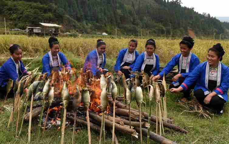 “金秋烤鱼季”是融水的苗族同胞欢庆丰收的特殊节目。每年稻田插秧后,苗族同胞便将田鲤(又称禾花鱼)鱼花放养在水田里,等到秋天收割时禾花鱼已经长大,于是人们就从田里捕获禾花鱼,直接在地头烤烤,以庆祝丰收。