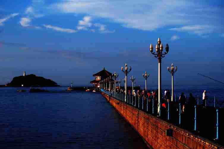 栈桥是青岛的象征,到青岛来的游客如果没有去看一看栈桥,那就等于没来青岛。桥尽头具有中国民族风格的翘角重檐建筑端庄地安坐于碧波之上,在海岸周边众多欧式建筑衬托下,尤显别致。栈桥全长440米,宽8米,钢混结构。桥南端筑半圆形防波堤,堤内建有民族形式的两蹭八角楼,名“回澜阁”,游人伫立阁旁,欣赏层层巨浪涌来,“飞阁回澜”被誉为“青岛十景”之一。桥北沿岸,辟为“栈桥公园”,园内花木扶疏,青松碧草,并设有石椅供游人憩坐,观赏海天景色。桥西侧立有华灯,入夜如株株玉兰盛开。