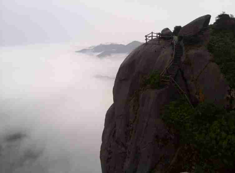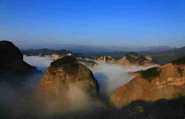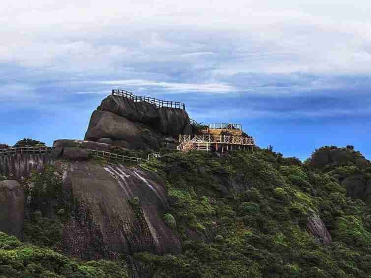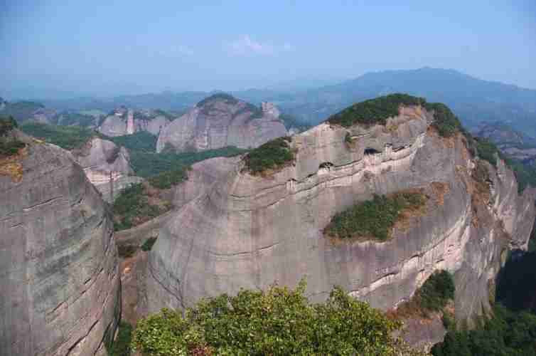 峰顶平台上存有建于明代的云台寺遗址。登上不足两平方米的观景台,放目远眺:一边是湖南新宁丹霞群,一边是广西资源的丹霞山峰群。