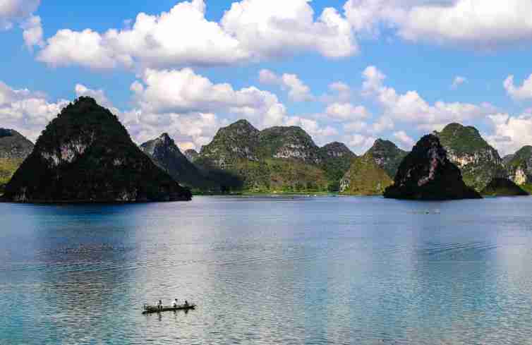 渠洋湖是一个大型的喀斯特高原湖泊水库。位于靖西县城西北方向28公里处,总面积为2469.9公顷,总库容量为9200万立方米,其中湖面宽为15540亩,湖长为15公里,最宽处有1公里,是百色市的第二大人工湖。水质优良,有大小岛屿十多个,沿岸有海拔一千多米的岜行山,以及掩映在绿树翠竹当中的几百个壮族干栏式村寨。