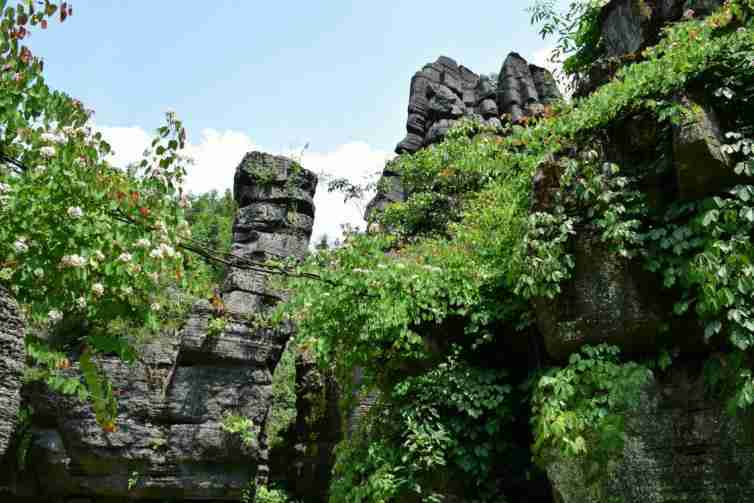方山石林就位于天柱山脚下,景区内修有多处栈道,因而人们也形象地称呼这里为“梯子寨”。不过,最引人注目的,还是这里奇峰瀑布和嶙峋怪石、绝壁峡谷。