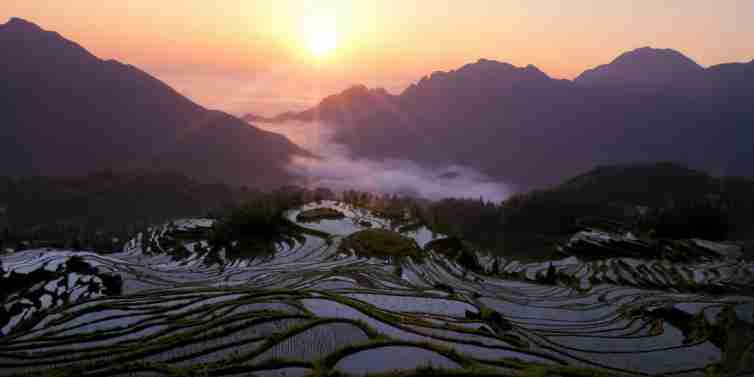 浙江丽水云和梯田跨越高寒,高山,丘陵,谷地四个地质景观带,拥有梯田,云海,山村,竹海,溪流,瀑布,雾凇等多个不同自然带,一年四季,云和有着截然不同的美景风光:春来水满田畴,夏至佳禾吐翠,金秋稻穗沉甸,寒冬瑞雪丰年。梯田的居民过着淡泊、安详、宁静、质朴的生活,这里被誉为“中国最美梯田”。