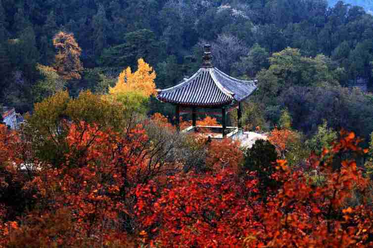 半山腰枫林上方的望枫台是最佳观赏处。那枫叶色素的变化往往顶部先红起,由上而下,循序变化,远望犹如一抹淡红云霞飘忽山上,气象万千,蔚为壮观。似烧非烟火,如花不待春