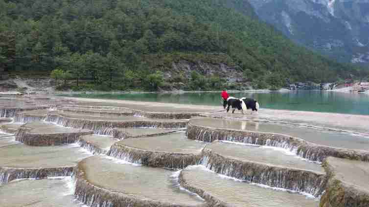 当蔚蓝的天倒映在水中,当青青的水草随风飘荡,绝对的世外桃源的感觉,而且光看图都感觉凉快了许多!灌丛的杜鹃开得一簇簇,给满山的苍翠点缀了一点儿别样的色彩。