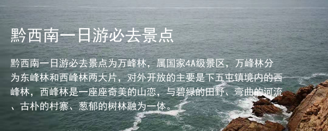 黔西南一日游必去景点为万峰林,属国家4A级景区,万峰林分为东峰林和西峰林两大片,对外开放的主要是下五屯镇境内的西峰林,西峰林是一座座奇美的山恋,与碧绿的田野、弯曲的河流、古朴的村寨、葱郁的树林融为一体。