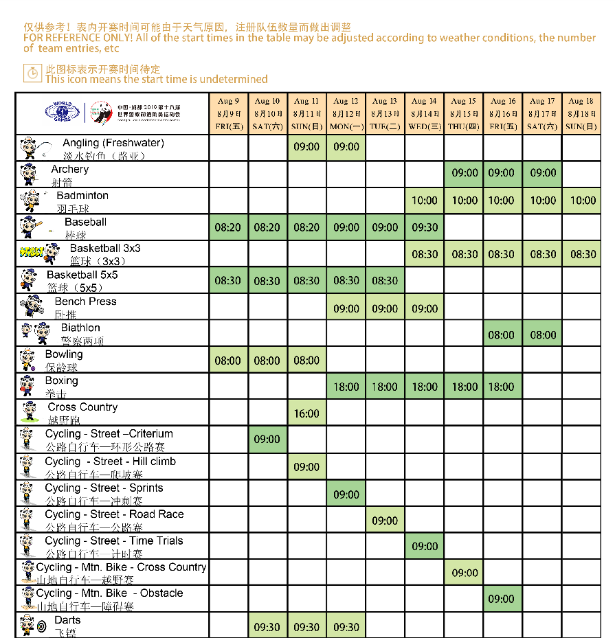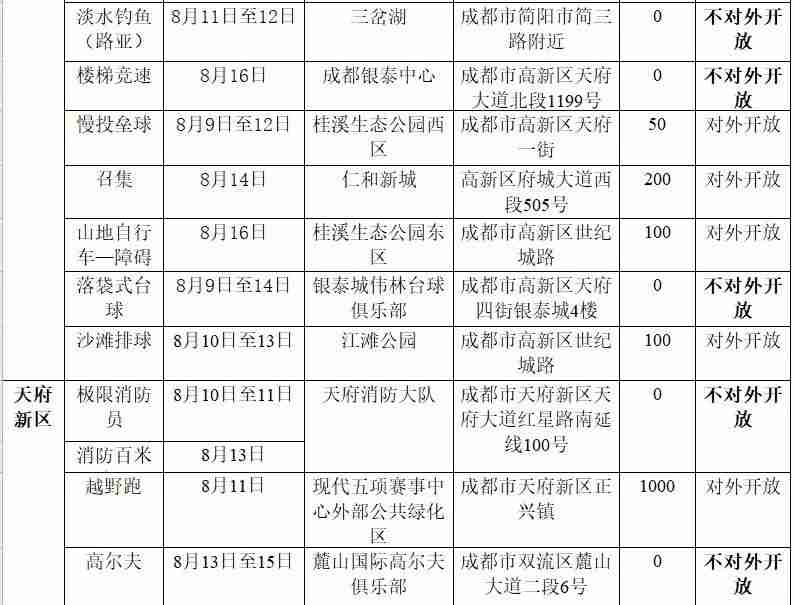 由表中可以看出,其中,淡水钓鱼(路亚)、楼梯竞速、落袋式台球、极限消防员、消防百米障碍、高尔夫、小口径步枪、气步枪、射箭、警察手枪实用射击、警察手枪战斗射击、警察两项、定向越野(中、长距离)等13个比赛项目不对外开放。其他四十三个比赛项目的场馆场地容量有限,大家先到先得喔~