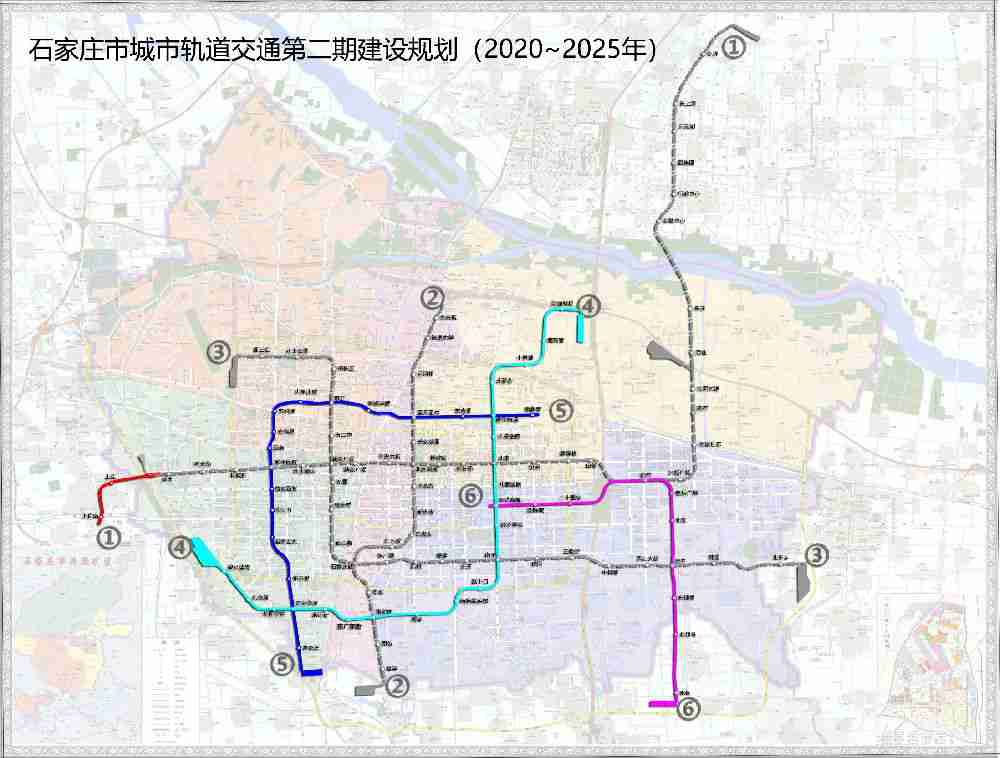 《石家庄市城市轨道交通第二期建设规划(2020~2025年)》包括:新建4号线、5号线一期、6号线一期、1号线三期工程,线路总长约64km,全部为地下敷设,车站共50座(换乘站按2座车站进行统计),车辆基地4座,主变电所1座,具体见下图。