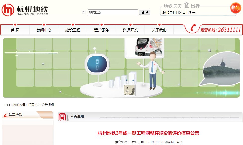 2019.10.30丨杭州地铁3号线一期工程调整环境影响评价信息公示