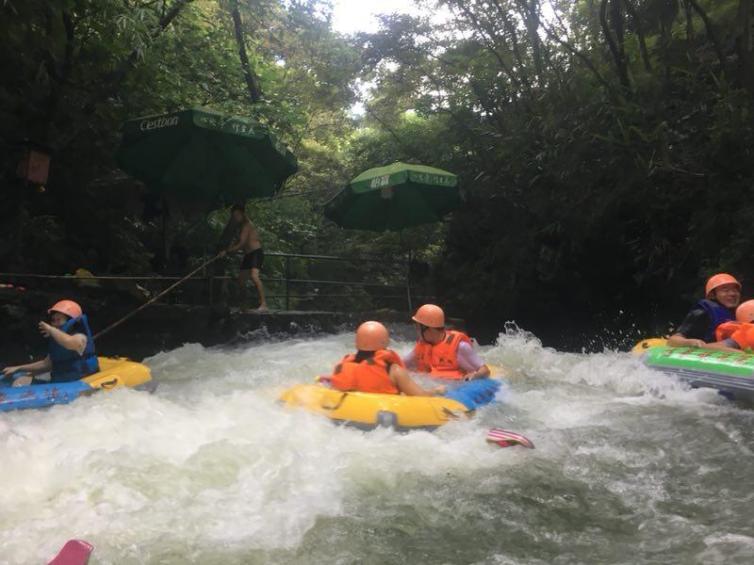 上午,分成两组进行野外战斗。下午,感受惊险刺激的狂狮河漂流。狂狮河漂流长约10公里,全程约需2.5个小时,水急、谷幽、石奇、崖险、花香、林密。