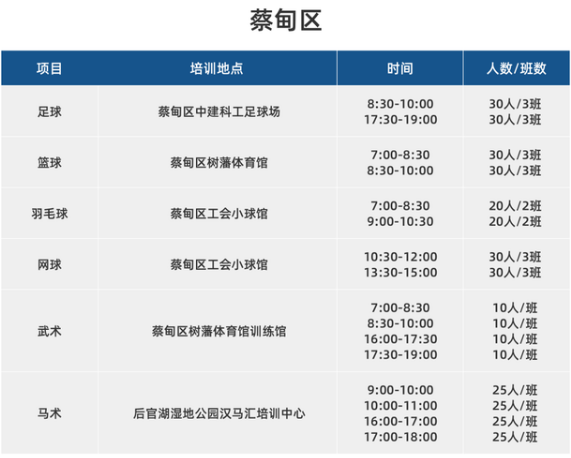 培训项目:足球、羽毛球、篮球、网球、武术、滑冰/滑雪、马术。