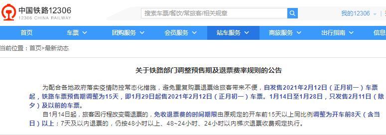 为配合各地政府落实疫情防控常态化措施,避免重复购票退票给旅客带来不便,自发售2021年2月12日(正月初一)车票起,铁路车票预售期调整为15天,即1月29日起售2021年2月12日(正月初一)车票。1月14日至1月28日,只发售2月11日(除夕)及以前的车票。