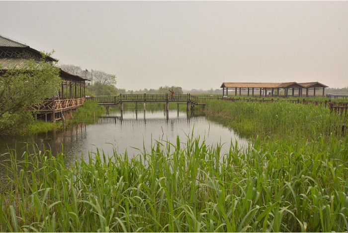 江南最大的天然湿地。湖面开阔如漾,水天一色。湖中有墩、墩中有湖,港中有汊,汊中套港,水网交错,宛如一座巨大的水上迷宫。大小土墩长年生长密密翠竹、野生芦苇、竹笋,树影婆娑,白鹭点点。