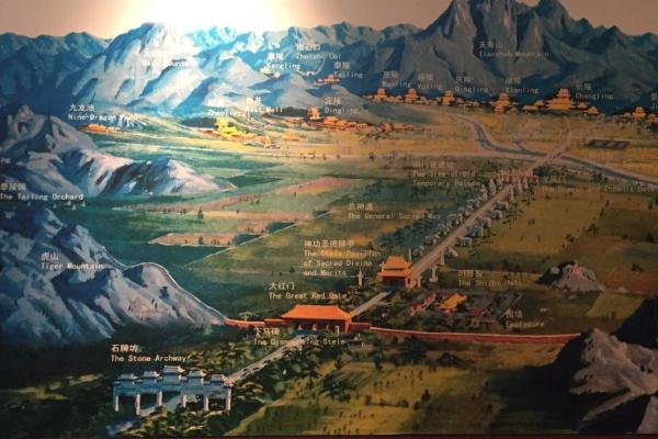 明十三陵是个统一的整体,而各陵又自成一体,每座陵墓分别建于一座山前,陵墓规格大同小异。陵与陵之间距离少至半公里,多至八公里。除思陵偏在西南一隅外,其余各陵均呈扇形分列于长陵左右。十三陵中目前仅开放有“长陵”、“定陵”、“昭陵”和“神路”。